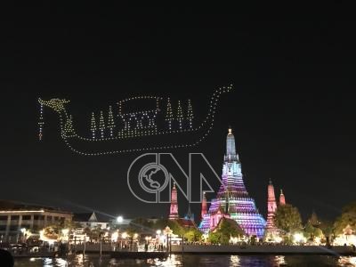 泰國政府11月16日至12月15日舉辦「2024年昭披耶河燈光盛會」,無人機在知名景點鄭王廟後方排列出王室遊船的圖樣。