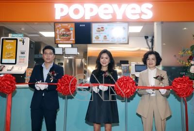 美國連鎖炸雞品牌Popeyes炸雞店進軍台北101,4日舉辦開幕活動,金皇食品股份有限公司執行長林恩繹(左)、董事長陳凱琳(中)與台北101總經理朱麗文(右)一同剪綵。