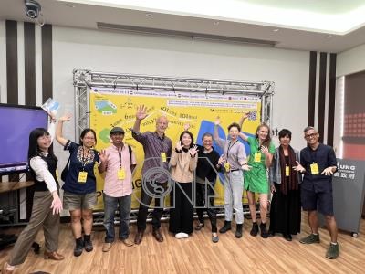 屏東大地藝術節14日開幕,有6個國家藝術家駐村,將遊戲融入創作,讓孩子、社區與大自然一起玩。屏東縣長周春米(左5)5日出席活動記者會,與藝術家們一同邀請民眾參與。