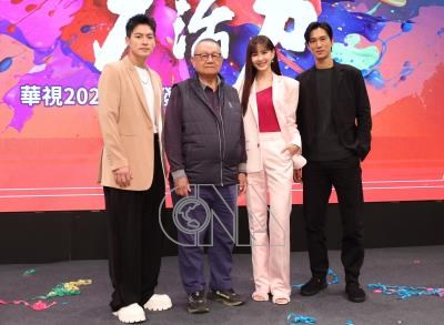 華視6日下午舉行「2025展望發布會」,戲劇「火車來去」導演李岳峰(左2)與演員安心亞(右2)、鍾承翰(右)、許孟哲(左)等人出席。