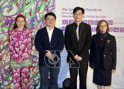 二二八事件紀念基金會7日下午在台北舉行「鐵幕裡的自由幽靈–以藝術作為抵抗的巴洛格作品展」開幕式,包含匈牙利貿易辦事處副代表于靜(Tamara Vér)(左起)、基金會執行長藍士博、內政部次長董建宏、台美文藝協會執行長李美華等人出席。