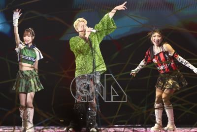香港歌手郭富城(中)睽違5年訪台,第5度站上台北小巨蛋開唱,27日晚間演出無冷場,最後壓軸更獻唱經典歌「對你愛不完」,將氣氛推到最高潮。