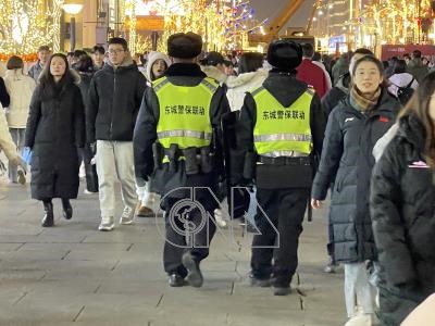在無差別傷人事件頻傳的陰影下,北京市31日跨年夜,王府井大街及街外通往天安門廣場的長安大街上,都布置了大量警力。圖為王府井大街2人一組的巡邏協警。