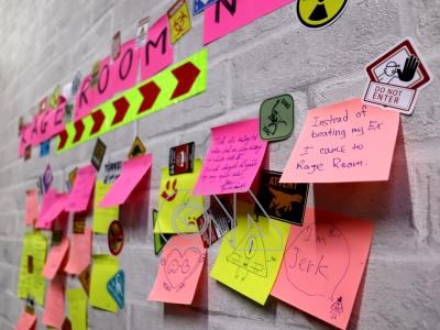 民眾到「憤怒屋」發洩完畢大多會在便利貼寫下心情,牆上紅紅黃黃的色塊記錄著各式各樣的故事。