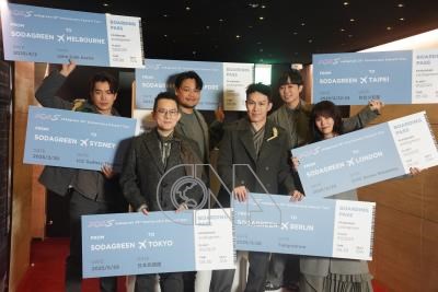 樂團蘇打綠10日下午在台北舉行復刻計畫最終章媒體發布會,公布2025巡迴演唱會站點,團員青峰(右2)、馨儀(右1)、小威(左2)、阿福(左3)、家凱(左1)、阿龔(右3)合影。