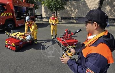 高雄市政府消防局17日舉行特種搜救大隊揭牌儀式,特搜人員示範操作多功能機器人。