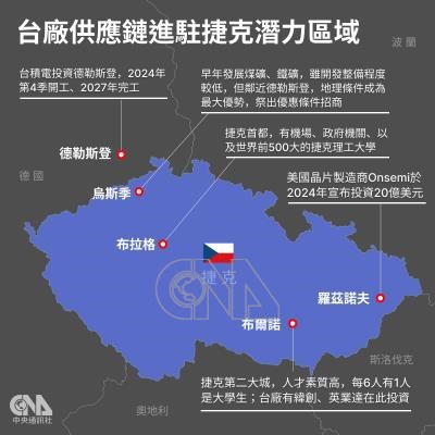 台積電在德國德勒斯登設廠,鄰近的捷克烏斯季以及第2大城布爾諾是台廠供應鏈進駐捷克的潛力區域。中央社製圖 114年2月8日
