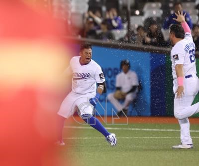 世界棒球經典賽資格賽(WBCQ)尼加拉瓜隊阿列古利亞(Benjamin Alegria)(後左)成球隊英雄,22日在資格賽第2戰10局下半敲出再見安,率隊以2比1搶下2連勝,他的隊友們興奮衝進場內慶祝。