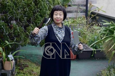 電影「殺夫」24日在台北市舉行媒體茶敘,原著作家李昂拿著道具接受媒體拍攝。