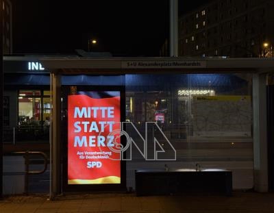 社民黨選舉期間競選廣告,標語「中間派,而非梅爾茨」,強調與另類選擇黨合作的梅爾茨已偏向極右翼,不再是傳統中間派政治人物。