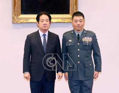 總統賴清德(左)26日上午主持「中華民國114年3月份將官晉任授階典禮」,宣布少將孔乃德(右)晉任中將,締造國軍第一位由基層士兵晉升中將的紀錄。