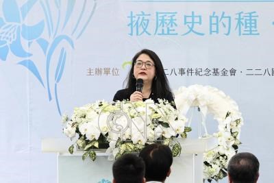 228事件78週年中樞紀念儀式28日上午在台北228國家紀念館舉行,228受難者李瑞漢孫女李慧生致詞。