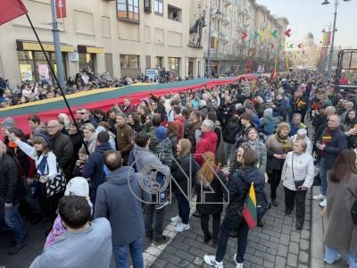 立陶宛11日慶祝恢復獨立35週年紀念日,民眾齊聚首都維爾紐斯慶祝。圖為「恢復獨立之路」遊行,民眾共同拉起巨型立陶宛與烏克蘭國旗布條遊行2公里,是立陶宛國慶的重要傳統。