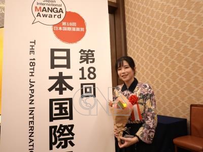 台灣漫畫家左萱以「芭蕉的芽」第2集奪得日本外務省主辦的第18屆日本國際漫畫賞優秀獎(銀獎),她12日晚間出席頒獎典禮,日本台灣交流協會贈送花束道賀。