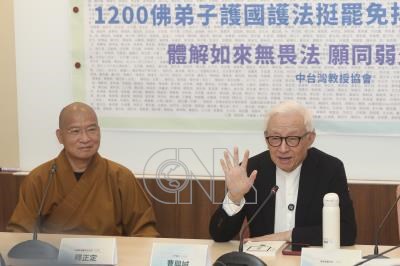 「千佛弟子護國護法 捍衛台灣民主自由」記者會14日上午在立法院舉行,聯電前董事長曹興誠(右)與前福智僧團梵音法師釋正定(左)共同表達捍衛台灣民主自由的決心。