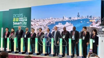 2025高雄智慧城市展20日在高雄展覽館開幕,聚焦「AI賦能」、「智慧醫療」、「淨零永續」3大核心主題,展出規模近500個攤位。高雄市副市長林欽榮(右6)等人共同啟動儀式。