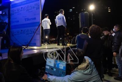國民黨22日晚間在新北市板橋區舉辦「反惡罷.護民主」還錢於民政策說明會,包含黨籍立委洪孟楷(台上右)、葉元之(台上左)等人都到場宣講。