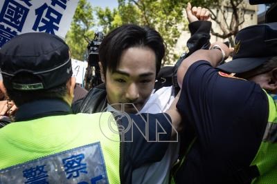 網紅「亞亞在台灣」劉姓陸配涉武統言論遭令離境,25日與民間團體赴內政部舉行記者會要求撤銷行政處分,網紅八炯(中)到場抗議,與警方發生推擠衝突。