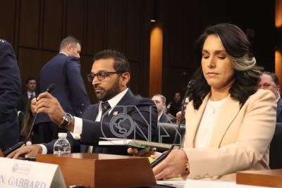 美國國家情報總監加巴德(右)及聯邦調查局局長巴特爾25日出席聯邦參議院聽證會,公布最新「全球威脅評估」報告。中央社記者鍾佑貞華盛頓攝 114年3月25日