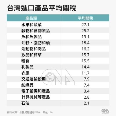 台灣進口產品關稅以農產品類別較高,水果和蔬菜平均27.1%居首;穀物和食物製品25.2%次之。電子設備和產品等項目進口關稅為3.4%。中央社製圖 114年3月25日