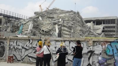 緬甸發生芮氏規模8.2強震,曼谷受到波及一棟興建中的大樓倒塌。受困工人的親友站在工地外望著倒塌建築物。