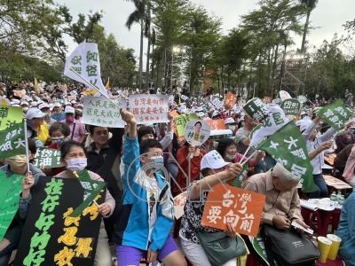 民進黨29日下午在高雄三民公園舉辦「人民是頭家」政策宣講會,現場湧進大批支持者,不少人手持標語、賣力揮舞,呼籲高雄人團結意志挺身而出。