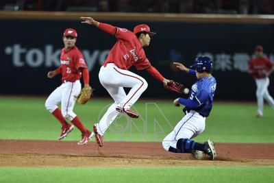 中華職棒例行賽4日在天母棒球場由富邦悍將隊與味全龍隊交手,悍將王念好(右)5局趁勢盜上2壘、站上得點圈。
