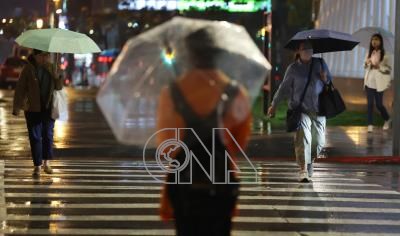 本週首波鋒面9日晚間起至10日通過,影響期間中部以北應防局部大雨,各地有陣雨或雷雨出現機率,民眾外出留意攜帶雨具。台北市松山區9日晚間開始出現降雨,街頭民眾撐傘遮擋。