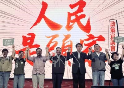 民進黨12日在新竹市辦「人民是頭家」政策宣講會,行政院長卓榮泰(中)與民進黨秘書長林右昌(右3)等人出席,攜手高呼口號呼籲民眾團結守護台灣。