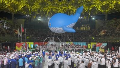 114年全國中等學校運動會19日晚間在台南市盛大舉行開幕典禮,鯨魚造型吉祥物「鯤鯓」的大型氣球在眾人牽引下飄過主舞台前,十分吸睛。