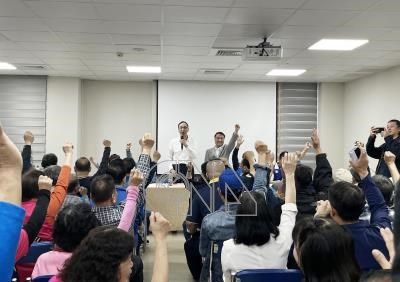 國民黨主席朱立倫(後左,白襯衫)25日上午出席「反惡罷、戰獨裁」說明會桃園楊梅場,批民進黨破壞台灣的民主,司法介入辦藍不辦綠,呼籲民眾不要讓民進黨一黨獨大、獨裁,明天凱道站出來。