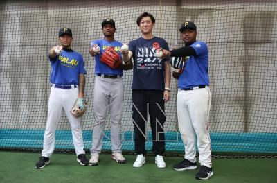 中信兄弟投手教練王建民(右2)28日前往國立體育大學指導帛琉棒球國家隊,並於結束後與球員合影留念。