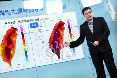 交通部中央氣象署「梅雨季展望」記者會29日在台北舉行,氣象預報中心主任陳怡良(圖)說明2025年梅雨季降雨熱點預測。