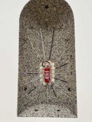 2025年「威尼斯建築雙年展」波蘭館以幽默且富想像力的方式,探討建築如何在現代社會提供安全感。現場有專為滅火器設計的壁龕,鑲嵌裝飾性的石頭與貝殼,將日常的安全設備提升為如同家神般的存在。