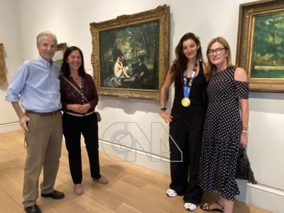 貝爾林(左2)是藝術系老師,她經常邀朋友一起來看印象派作品。今天她和家人及遠從巴西前來英國旅遊的朋友納札里恩(右2)一起看畫展。一行人站在法國畫家愛德華.馬奈「草地上的午餐」前細細觀賞。