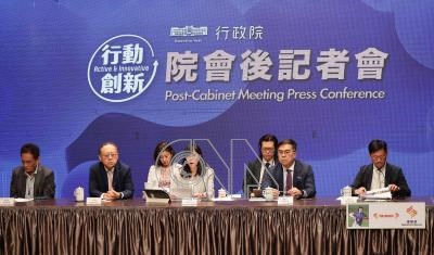 行政院會後記者會15日於新聞中心舉行,由行政院發言人李慧芝(前中)主持,環境部長彭啓明(前右2)、行政院政務委員史哲(前左2)、國科會副主委陳炳宇(後右)、衛福部政務次長林靜儀(後左)等出席。