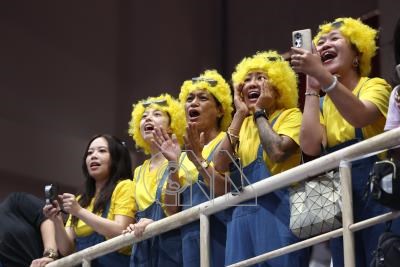 2025年雙北世界壯年運動會跆拳道對打競賽28日在新北市板樹體育館登場,前跆拳道國手夏顯詠在個人女子49公斤級出賽,場邊加油團用心裝扮地為她加油。