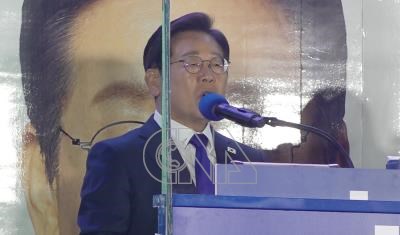 李在明偕夫人向支持者發表談話