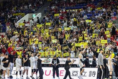 台灣職業籃球大聯盟(TPBL)新北國王隊7日晚間在季後賽第4戰擊敗台北台新戰神隊,以4連勝之姿確定前進總冠軍賽;比賽結束瞬間,觀眾席國王球迷高聲歡呼。