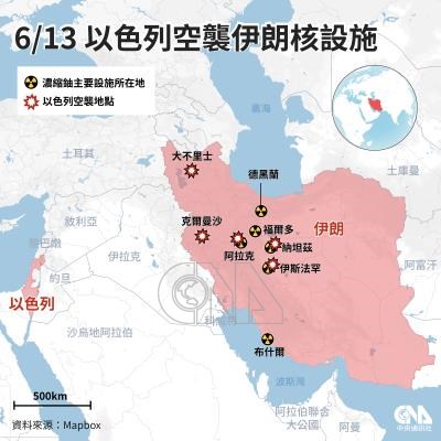 以色列13日清晨空襲伊朗多處,打擊包括首都德黑蘭周邊至少6個軍事基地、2個戒備森嚴的軍事指揮官住宅區和多棟住宅大樓,西北部大不里士(Tabriz)一處核子研究中心、2座軍事基地,伊朗濃縮鈾主要設施所在的納坦茲(Natanz)、阿拉克(Arak)、伊斯法罕(Isfahan)與克爾曼沙(Kermanshah)等地。中央社製圖 114年6月13日