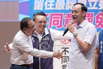 國民黨主席朱立倫(右)14日與新北市長侯友宜(左)在新北市淡水區,出席「反惡罷、戰獨裁」新北市淡水場政策說明會,致詞力挺國民黨立委洪孟楷(中)。