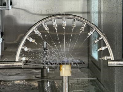 蘋果公司美國矽谷總部Apple Park附近,有一間鮮少對外開放的Durability Lab(耐用度實驗室),中央社記者前往觀察可模擬降雨或噴水情境的防水測試艙,用來評估iPhone等產品的防水性能。