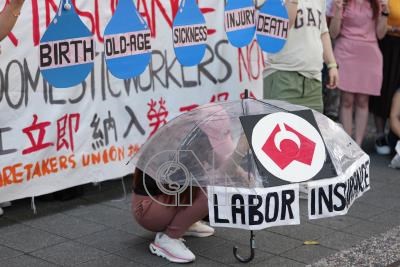 桃園市家庭看護工職業工會15日在多個移工及人權團體陪同下,前往勞動部陳情,呼籲將家事移工納入勞保強制納保的對象。現場演出行動劇,象徵期盼納入勞保能成為家事移工保護傘。