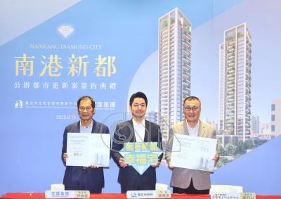「南港新都公辦都市更新案」簽約典禮19日在台北舉行,由台北市住宅及都市更新中心董事長李四川(右)與本案出資者宏匯股份有限公司董事長許崑泰(左),簽署出資暨實施都市更新事業契約;台北市長蔣萬安(中)出席見證。