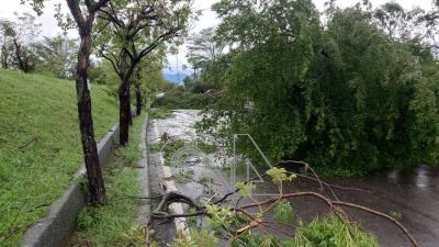 颱風丹娜絲襲台為嘉義帶來強烈風雨,7日八掌溪兩側的防汛道路也因樹木倒塌而無法通行。