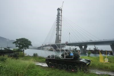 國軍「漢光41號」演習實兵演練11日進入第3天,陸軍弟兄將戰車開到淡江大橋新建工程旁,模擬防範共軍強行穿越淡水河口直攻政經中樞。