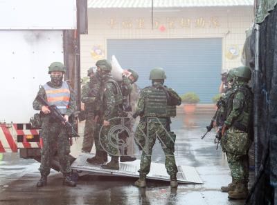 國軍「漢光41號」演習實兵演練11日進入第3天,國軍演練灰色地帶襲擾應處,陸軍206旅步三營戰鬥支援連的官兵進行臨戰訓練,模擬接收物資的後勤地點遭受中國特工襲擾,實施相關防禦作為。
