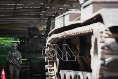 國軍「漢光41號」實兵操演16日進入第8天,陸軍模擬CM11戰車機動過程中故障,通知前進支援小組保修,一旁則有官兵持槍警戒。