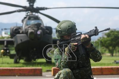 「漢光41號演習」持續進行,陸軍航空601旅17日在新北市樹林區執行陸航直昇機油彈再整補作業,出動AH-64E阿帕契攻擊直升機(後)在地面進行掛彈操演,官兵在前方持槍戒備。