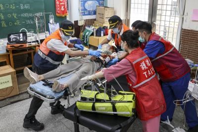台北市2025城鎮韌性(防空)演習17日下午登場,其中選在中山國小進行戰時急救站及災民收容救濟站開設演練,現場模擬重傷緊急救護與收容安置等情境。